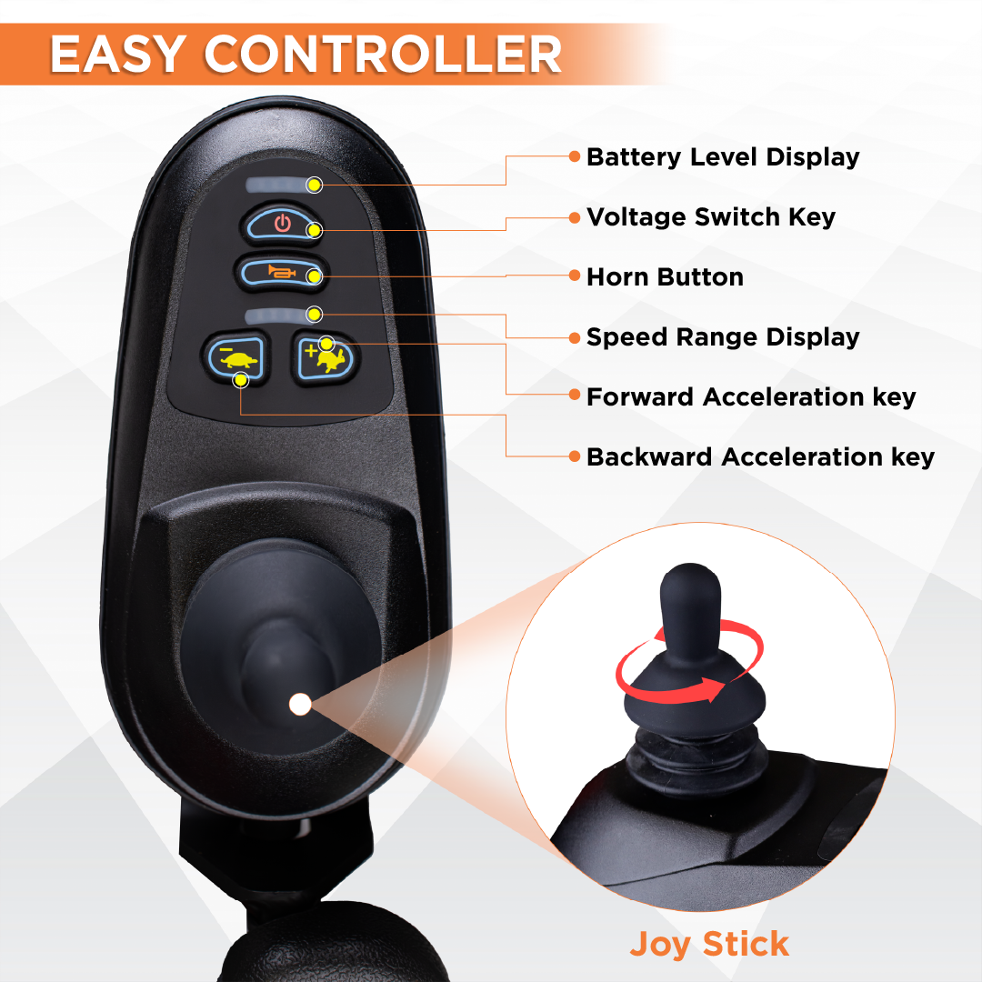 User-friendly joystick with speed controls, horn, and battery indicators ensures smooth navigation. Can be adjusted for both right- and left-handed users.